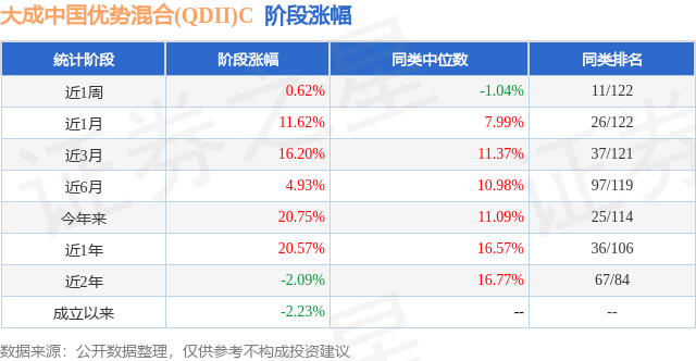 从业绩表现来看,大成中国优势混合(QDII)C基金过去一年净值涨幅为20.57%,在同类基金中排名36/106,同类基金过去一年净值涨幅中位数为16.57%。而基金过去一年的最大回撤为-21.42%,成立以来的最大回撤为-31.08%。