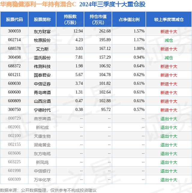 从基金规模来看,华商稳健添利一年持有混合C基金2024年三季度公布的基金规模为0.07亿元,较上一期规模804.99万元变化了-64.55万元,环比变化了-8.02%。该基金最新一期资产配置为:股票占净值比23.31%,债券占净值比30.7%,现金占净值比44.65%。从基金持仓来看,该基金当季前十大股票仓位达8.34%,第一大重仓股为东方财富(300059),持仓占比为1.57%。