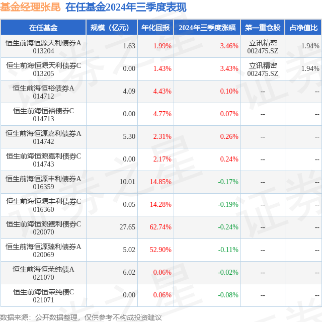 从基金规模来看,恒生前海恒源天利债券C基金2024年三季度公布的基金规模为0.0亿元,较上一期规模33.04万元变化了8.76万元,环比变化了26.52%。该基金最新一期资产配置为:股票占净值比14.4%,债券占净值比83.59%,现金占净值比8.18%。从基金持仓来看,该基金当季前十大股票仓位达10.28%,第一大重仓股为立讯精密(002475),持仓占比为1.94%。