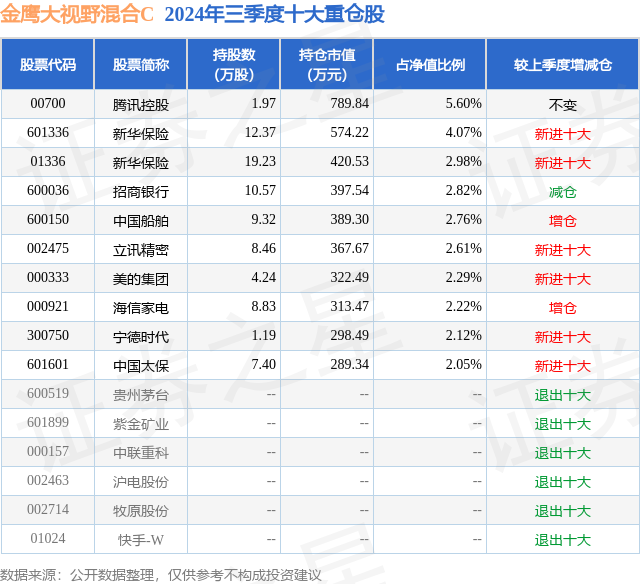 从基金规模来看,金鹰大视野混合C基金2024年三季度公布的基金规模为0.75亿元,较上一期规模7093.53万元变化了378.17万元,环比变化了5.33%。该基金最新一期资产配置为:股票占净值比93.9%,无债券类资产,现金占净值比0.24%。从基金持仓来看,该基金当季前十大股票仓位达29.52%,第一大重仓股为腾讯控股(00700),持仓占比为5.6%。