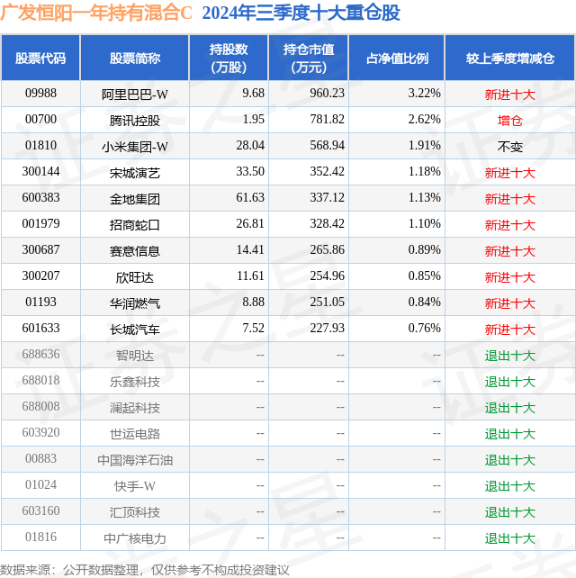 从基金规模来看,广发恒阳一年持有混合C基金2024年三季度公布的基金规模为1.27亿元,较上一期规模1.29亿元变化了-178.52万元,环比变化了-1.38%。该基金最新一期资产配置为:股票占净值比40.56%,债券占净值比85.46%,现金占净值比1.79%。从基金持仓来看,该基金当季前十大股票仓位达14.5%,第一大重仓股为阿里巴巴-W(09988),持仓占比为3.22%。