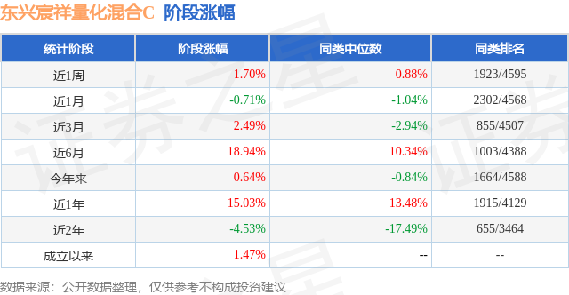 从业绩表现来看,东兴宸祥量化混合C基金过去一年净值涨幅为3.14%,在同类基金中排名2458/3979,同类基金过去一年净值涨幅中位数为5.4%。而基金过去一年的最大回撤为-25.26%,成立以来的最大回撤为-31.12%。