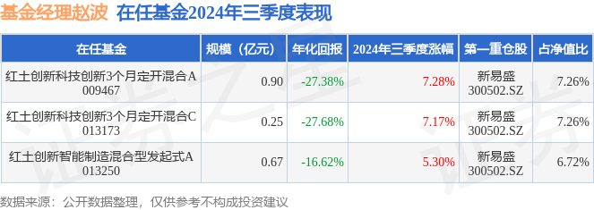 红土创新科技创新3个月定开混合C现任基金经理为赵波。其中在任基金经理赵波已从业9年又29天,2024年2月7日正式接手管理红土创新科技创新3个月定开混合C,任职期间累计回报为54.51%。目前还管理着3只基金产品(包括A类和C类),其中本季度表现最佳的基金为红土创新科技创新3个月定开混合A(009467),季度净值涨幅为7.28%。
