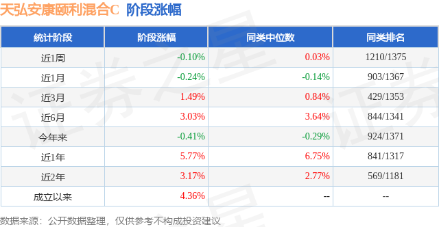 从业绩表现来看,天弘安康颐利混合C基金过去一年净值涨幅为4.32%,在同类基金中排名663/1322,同类基金过去一年净值涨幅中位数为4.43%。而基金过去一年的最大回撤为-0.91%,成立以来的最大回撤为-3.43%。