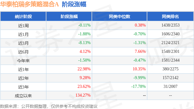 从业绩表现来看,华泰柏瑞多策略混合A基金过去一年净值涨幅为17.78%,在同类基金中排名195/2261,同类基金过去一年净值涨幅中位数为5.1%。而基金过去一年的最大回撤为-20.73%,成立以来的最大回撤为-33.37%。