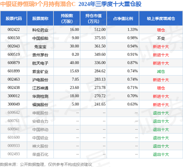 从基金规模来看,中银证券恒瑞9个月持有混合C基金2024年三季度公布的基金规模为1.01亿元,较上一期规模1.05亿元变化了-379.69万元,环比变化了-3.63%。该基金最新一期资产配置为:股票占净值比26.38%,债券占净值比91.24%,现金占净值比1.74%。从基金持仓来看,该基金当季前十大股票仓位达8.55%,第一大重仓股为科伦药业(002422),持仓占比为1.33%。