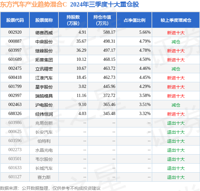 从基金规模来看,东方汽车产业趋势混合C基金2024年三季度公布的基金规模为0.44亿元,较上一期规模4099.51万元变化了326.37万元,环比变化了7.96%。该基金最新一期资产配置为:股票占净值比94.73%,债券占净值比5.15%,现金占净值比0.53%。从基金持仓来看,该基金当季前十大股票仓位达43.34%,第一大重仓股为德赛西威(002920),持仓占比为5.66%。