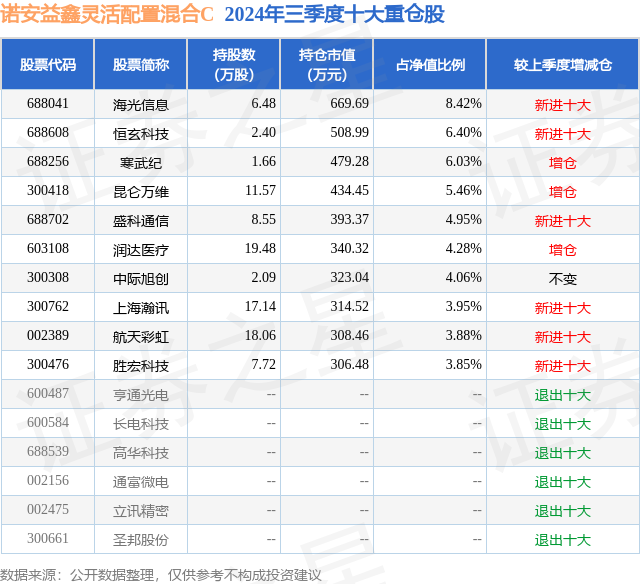 从基金规模来看,诺安益鑫灵活配置混合C基金2024年三季度公布的基金规模为0.33亿元,较上一期规模364.49万元变化了2941.41万元,环比变化了806.99%。该基金最新一期资产配置为:股票占净值比78.2%,无债券类资产,现金占净值比20.54%。从基金持仓来看,该基金当季前十大股票仓位达51.28%,第一大重仓股为海光信息(688041),持仓占比为8.42%。