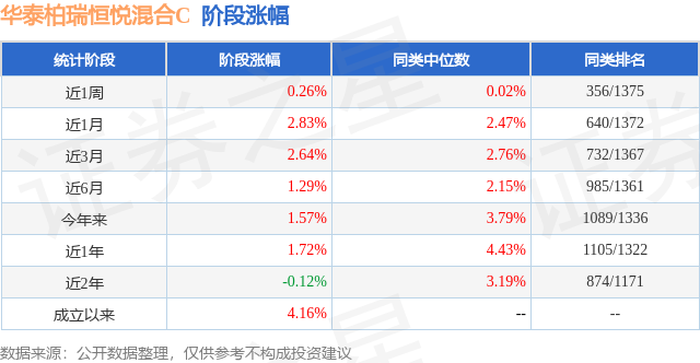 从业绩表现来看,华泰柏瑞恒悦混合C基金过去一年净值涨幅为1.72%,在同类基金中排名1105/1322,同类基金过去一年净值涨幅中位数为4.43%。而基金过去一年的最大回撤为-3.48%,成立以来的最大回撤为-5.41%。