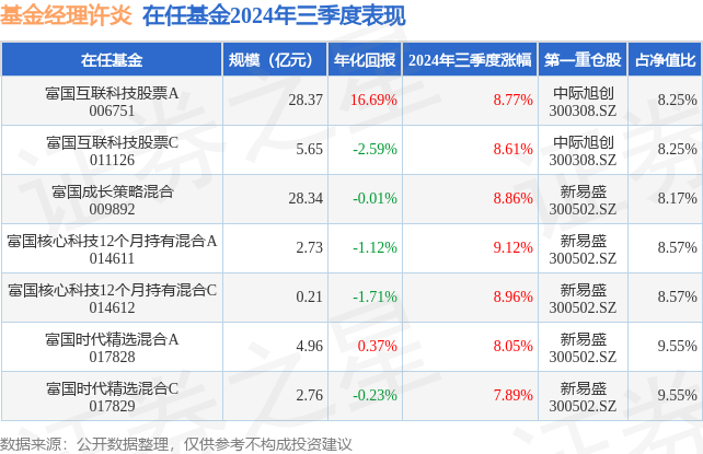 从基金规模来看,富国核心科技12个月持有混合A基金2024年三季度公布的基金规模为2.73亿元,较上一期规模2.6亿元变化了1252.13万元,环比变化了4.81%。该基金最新一期资产配置为:股票占净值比85.21%,无债券类资产,现金占净值比13.82%。从基金持仓来看,该基金当季前十大股票仓位达58.53%,第一大重仓股为新易盛(300502),持仓占比为8.57%。