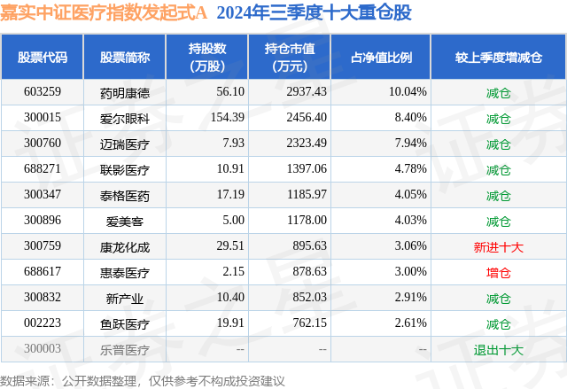 从基金规模来看,嘉实中证医疗指数发起式A基金2024年三季度公布的基金规模为0.3亿元,较上一期规模2198.18万元变化了798.63万元,环比变化了36.33%。该基金最新一期资产配置为:股票占净值比92.35%,无债券类资产,现金占净值比5.36%。从基金持仓来看,该基金当季前十大股票仓位达50.82%,第一大重仓股为药明康德(603259),持仓占比为10.04%。
