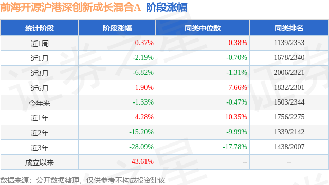 从业绩表现来看,前海开源沪港深创新成长混合A基金过去一年净值涨幅为-0.83%,在同类基金中排名1721/2261,同类基金过去一年净值涨幅中位数为5.1%。而基金过去一年的最大回撤为-24.7%,成立以来的最大回撤为-57.06%。