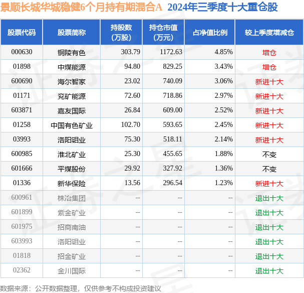 从基金规模来看,景顺长城华城稳健6个月持有期混合A基金2024年三季度公布的基金规模为1.42亿元,较上一期规模1.26亿元变化了1543.26万元,环比变化了12.22%。该基金最新一期资产配置为:股票占净值比34.28%,债券占净值比53.64%,现金占净值比11.94%。从基金持仓来看,该基金当季前十大股票仓位达25.89%,第一大重仓股为铜陵有色(000630),持仓占比为4.85%。