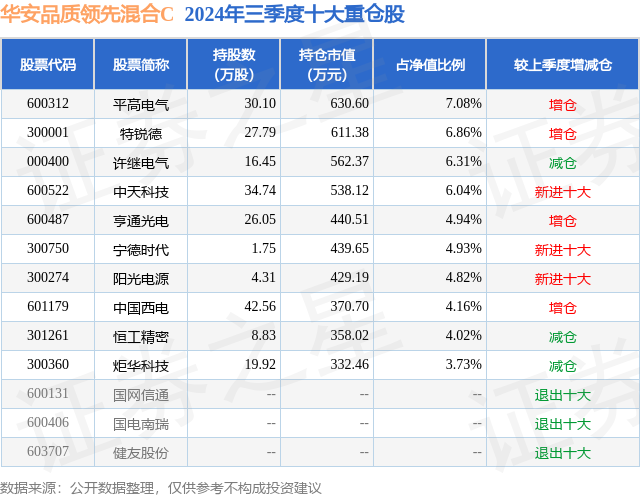 从基金规模来看,华安品质领先混合C基金2024年三季度公布的基金规模为0.12亿元,较上一期规模1133.71万元变化了75.08万元,环比变化了6.62%。该基金最新一期资产配置为:股票占净值比80.98%,无债券类资产,现金占净值比12.69%。从基金持仓来看,该基金当季前十大股票仓位达52.89%,第一大重仓股为平高电气(600312),持仓占比为7.08%。