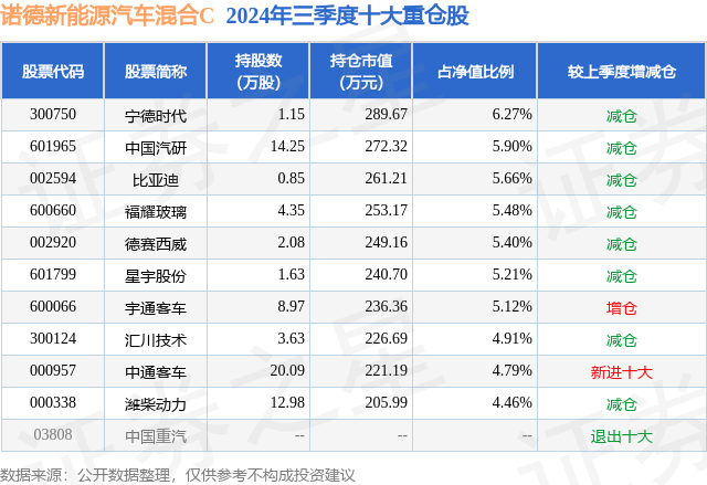 从基金规模来看,诺德新能源汽车混合C基金2024年三季度公布的基金规模为0.24亿元,较上一期规模3362.92万元变化了-999.57万元,环比变化了-29.72%。该基金最新一期资产配置为:股票占净值比93.22%,无债券类资产,现金占净值比6.54%。从基金持仓来看,该基金当季前十大股票仓位达53.2%,第一大重仓股为宁德时代(300750),持仓占比为6.27%。