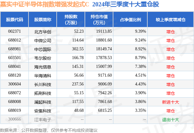 从基金规模来看,嘉实中证半导体指数增强发起式C基金2024年三季度公布的基金规模为18.13亿元,较上一期规模9.82亿元变化了8.31亿元,环比变化了84.64%。该基金最新一期资产配置为:股票占净值比92.65%,债券占净值比0.6%,现金占净值比5.11%。从基金持仓来看,该基金当季前十大股票仓位达63.77%,第一大重仓股为北方华创(002371),持仓占比为9.39%。
