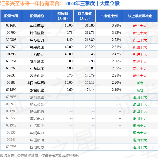 从基金规模来看,汇泉兴至未来一年持有混合C基金2024年三季度公布的基金规模为0.12亿元,较上一期规模1209.22万元变化了-43.28万元,环比变化了-3.58%。该基金最新一期资产配置为:股票占净值比77.9%,无债券类资产,现金占净值比22.23%。从基金持仓来看,该基金当季前十大股票仓位达26.98%,第一大重仓股为华泰证券(601688),持仓占比为3.98%。