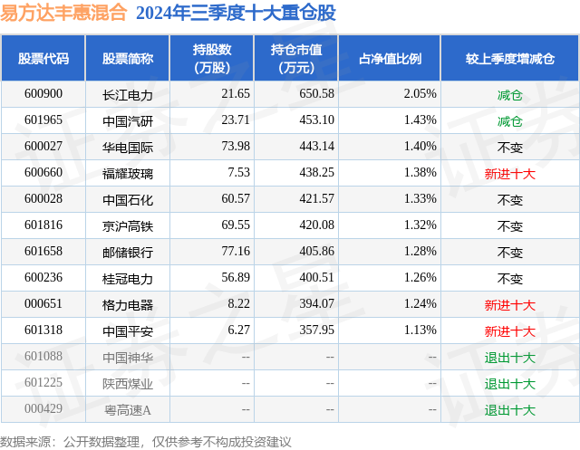 从基金规模来看,易方达丰惠混合基金2024年三季度公布的基金规模为3.17亿元,较上一期规模3.16亿元变化了110.81万元,环比变化了0.35%。该基金最新一期资产配置为:股票占净值比24.04%,债券占净值比106.35%,现金占净值比2.19%。从基金持仓来看,该基金当季前十大股票仓位达13.82%,第一大重仓股为长江电力(600900),持仓占比为2.05%。