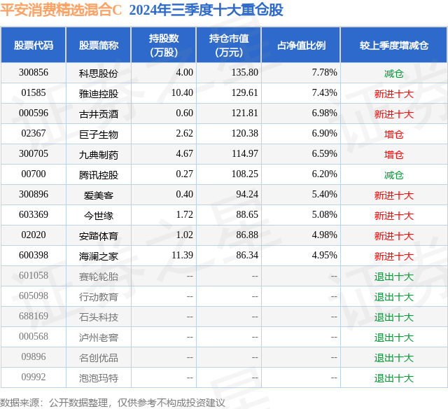 从基金规模来看,平安消费精选混合C基金2024年三季度公布的基金规模为0.07亿元,较上一期规模661.36万元变化了48.1万元,环比变化了7.27%。该基金最新一期资产配置为:股票占净值比88.95%,无债券类资产,现金占净值比11.39%。从基金持仓来看,该基金当季前十大股票仓位达62.29%,第一大重仓股为科思股份(300856),持仓占比为7.78%。