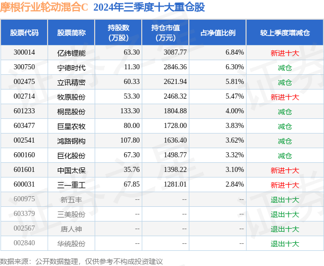 从基金规模来看,摩根行业轮动混合C基金2024年三季度公布的基金规模为0.01亿元,较上一期规模97.68万元变化了4.01万元,环比变化了4.11%。该基金最新一期资产配置为:股票占净值比83.89%,无债券类资产,现金占净值比7.2%。从基金持仓来看,该基金当季前十大股票仓位达45.13%,第一大重仓股为亿纬锂能(300014),持仓占比为6.84%。