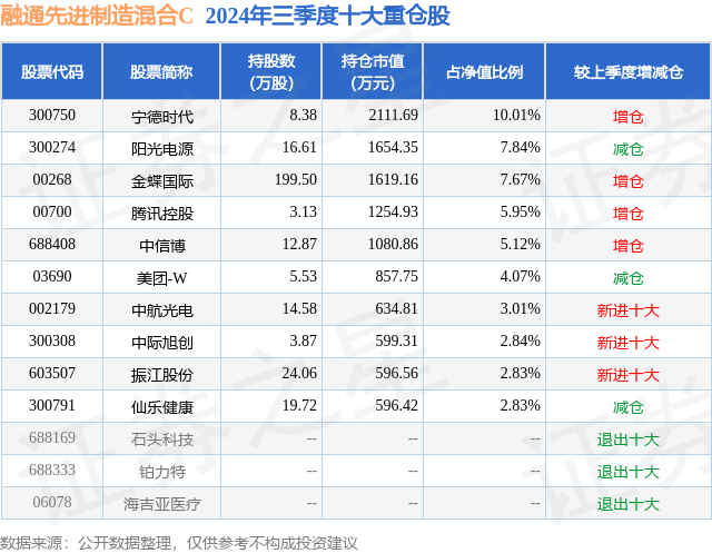 从基金规模来看,融通先进制造混合C基金2024年三季度公布的基金规模为0.15亿元,较上一期规模1240.6万元变化了242.27万元,环比变化了19.53%。该基金最新一期资产配置为:股票占净值比92.88%,无债券类资产,现金占净值比6.75%。从基金持仓来看,该基金当季前十大股票仓位达52.17%,第一大重仓股为宁德时代(300750),持仓占比为10.01%。