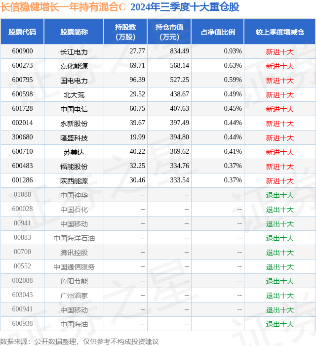 从基金规模来看,长信稳健增长一年持有混合C基金2024年三季度公布的基金规模为3.81亿元,较上一期规模4.42亿元变化了-6126.42万元,环比变化了-13.85%。该基金最新一期资产配置为:股票占净值比12.86%,债券占净值比91.47%,现金占净值比3.43%。从基金持仓来看,该基金当季前十大股票仓位达5.12%,第一大重仓股为长江电力(600900),持仓占比为0.93%。