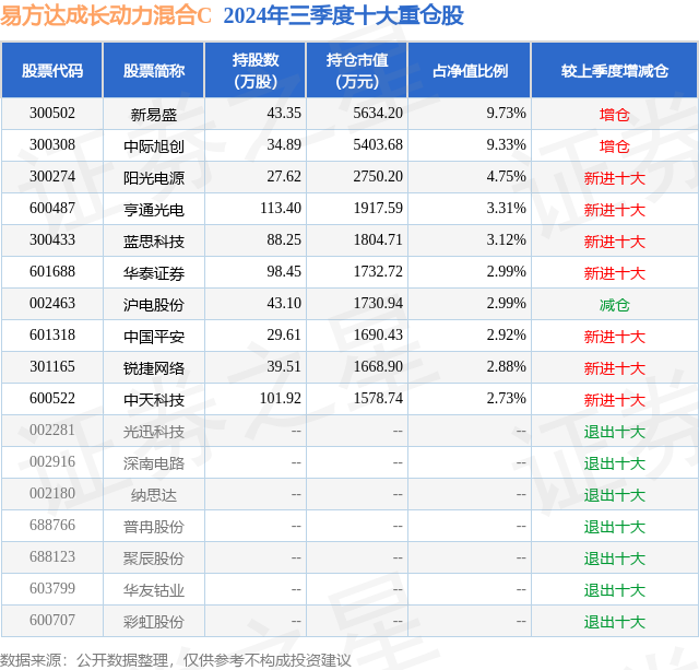 从基金规模来看,易方达成长动力混合C基金2024年三季度公布的基金规模为3.27亿元,较上一期规模2.5亿元变化了7686.34万元,环比变化了30.76%。该基金最新一期资产配置为:股票占净值比88.14%,无债券类资产,现金占净值比19.73%。从基金持仓来看,该基金当季前十大股票仓位达44.75%,第一大重仓股为新易盛(300502),持仓占比为9.73%。