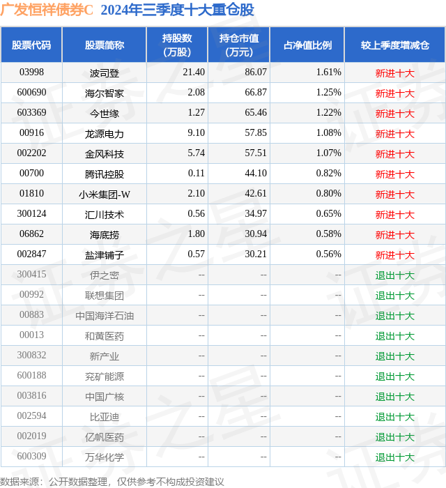 从基金规模来看,广发恒祥债券C基金2024年三季度公布的基金规模为0.0亿元,较上一期规模38.12万元变化了-2.39万元,环比变化了-6.28%。该基金最新一期资产配置为:股票占净值比19.0%,债券占净值比84.64%,现金占净值比12.85%。从基金持仓来看,该基金当季前十大股票仓位达9.64%,第一大重仓股为波司登(03998),持仓占比为1.61%。