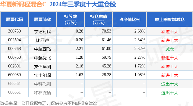 从基金规模来看,华夏新锦程混合C基金2024年三季度公布的基金规模为0.26亿元,较上一期规模2258.72万元变化了334.93万元,环比变化了14.83%。该基金最新一期资产配置为:股票占净值比12.42%,债券占净值比5.83%,现金占净值比82.06%。从基金持仓来看,该基金当季前十大股票仓位达12.41%,第一大重仓股为宁德时代(300750),持仓占比为2.68%。