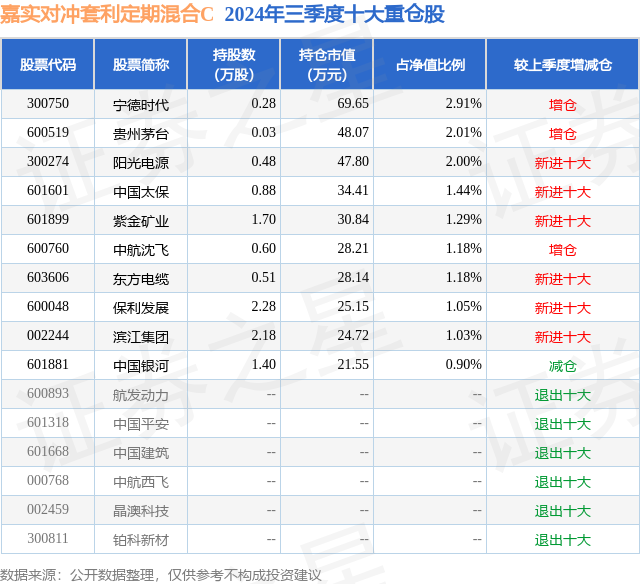 从基金规模来看,嘉实对冲套利定期混合C基金2024年三季度公布的基金规模为0.0亿元,较上一期规模0.6万元变化了-0.1万元,环比变化了-16.58%。该基金最新一期资产配置为:股票占净值比59.33%,债券占净值比0.54%,现金占净值比32.83%。从基金持仓来看,该基金当季前十大股票仓位达14.99%,第一大重仓股为宁德时代(300750),持仓占比为2.91%。