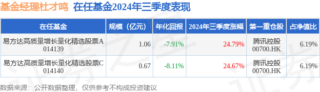 证券之星消息,日前易方达高质量增长量化精选股票A基金公布三季报,2024年三季度最新规模1.06亿元,季度净值涨幅为24.79%。