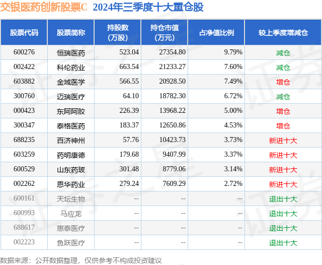 从基金规模来看,交银医药创新股票C基金2024年三季度公布的基金规模为1.52亿元,较上一期规模1.53亿元变化了-117.15万元,环比变化了-0.77%。该基金最新一期资产配置为:股票占净值比83.79%,无债券类资产,现金占净值比17.82%。从基金持仓来看,该基金当季前十大股票仓位达54.09%,第一大重仓股为恒瑞医药(600276),持仓占比为9.79%。
