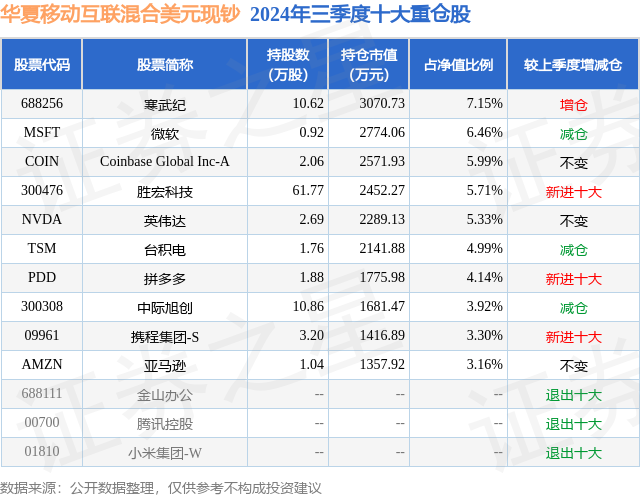 从基金规模来看,华夏移动互联混合美元现钞基金2024年三季度公布的基金规模为4.29亿元,较上一期规模4.34亿元变化了-487.14万元,环比变化了-1.12%。该基金最新一期资产配置为:股票占净值比76.22%,债券占净值比5.05%,现金占净值比3.05%。从基金持仓来看,该基金当季前十大股票仓位达50.15%,第一大重仓股为寒武纪(688256),持仓占比为7.15%。