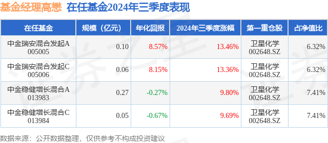 从基金规模来看,中金稳健增长混合A基金2024年三季度公布的基金规模为0.27亿元,较上一期规模2994.83万元变化了-315.81万元,环比变化了-10.55%。该基金最新一期资产配置为:股票占净值比73.29%,债券占净值比7.66%,现金占净值比10.86%。从基金持仓来看,该基金当季前十大股票仓位达40.9%,第一大重仓股为卫星化学(002648),持仓占比为7.41%。