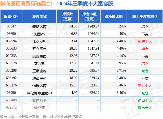 从基金规模来看,华商医药消费精选混合C基金2024年三季度公布的基金规模为0.16亿元,较上一期规模1425.93万元变化了124.94万元,环比变化了8.76%。该基金最新一期资产配置为:股票占净值比88.63%,无债券类资产,现金占净值比11.55%。从基金持仓来看,该基金当季前十大股票仓位达40.7%,第一大重仓股为泰格医药(03347),持仓占比为5.24%。