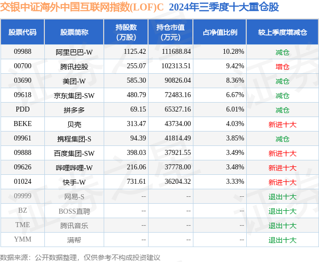 从基金规模来看,交银中证海外中国互联网指数(LOF)C基金2024年三季度公布的基金规模为1.92亿元,较上一期规模1.37亿元变化了5502.99万元,环比变化了40.11%。该基金最新一期资产配置为:股票占净值比63.68%,无债券类资产,现金占净值比6.68%。从基金持仓来看,该基金当季前十大股票仓位达58.92%,第一大重仓股为阿里巴巴-W(09988),持仓占比为10.28%。