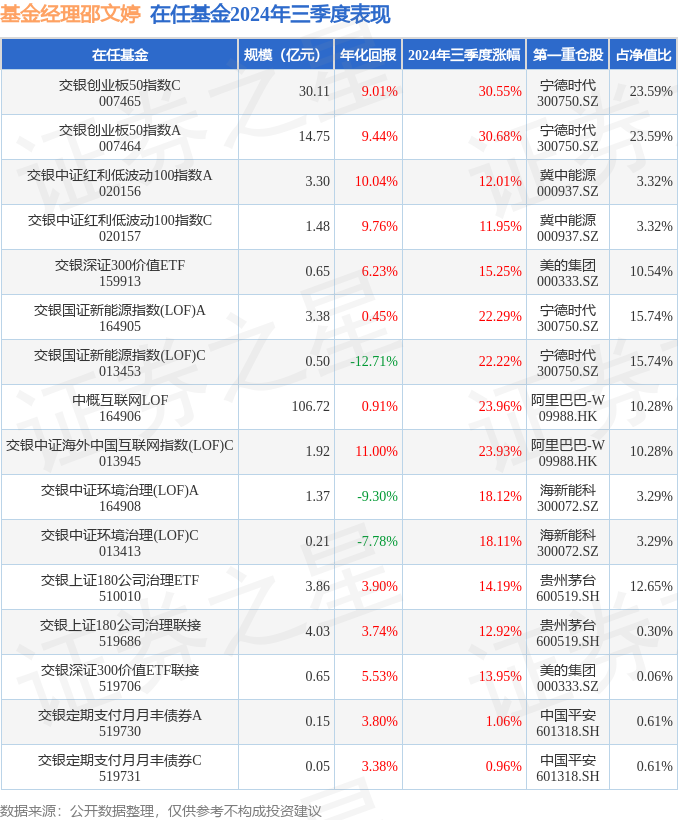交银中证海外中国互联网指数(LOF)C现任基金经理为邵文婷。其中在任基金经理邵文婷已从业3年又181天,2023年6月12日正式接手管理交银中证海外中国互联网指数(LOF)C,任职期间累计回报为15.37%。目前还管理着16只基金产品(包括A类和C类),其中本季度表现最佳的基金为交银创业板50指数A(007464),季度净值涨幅为30.68%。