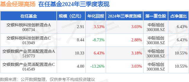 证券之星消息,日前交银科锐科技创新混合C基金公布三季报,2024年三季度最新规模0.44亿元,季度净值涨幅为2.88%。