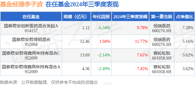 从基金规模来看,国泰君安创新医药混合发起A基金2024年三季度公布的基金规模为1.12亿元,较上一期规模1.06亿元变化了558.19万元,环比变化了5.25%。该基金最新一期资产配置为:股票占净值比86.86%,无债券类资产,现金占净值比13.27%。从基金持仓来看,该基金当季前十大股票仓位达43.86%,第一大重仓股为恒瑞医药(600276),持仓占比为7.28%。