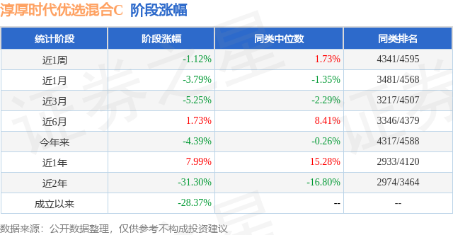 从业绩表现来看,淳厚时代优选混合C基金过去一年净值涨幅为-6.75%,在同类基金中排名3522/3979,同类基金过去一年净值涨幅中位数为5.4%。而基金过去一年的最大回撤为-27.16%,成立以来的最大回撤为-40.63%。