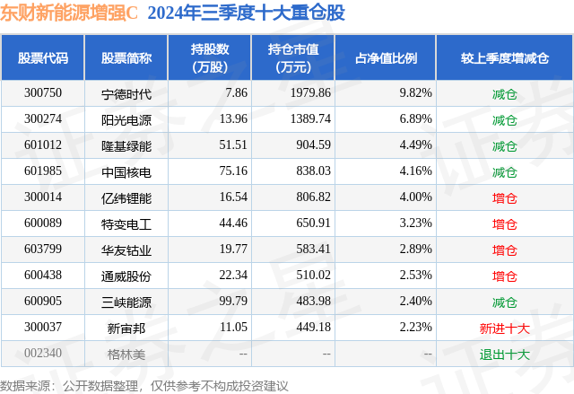 从基金规模来看,东财新能源增强C基金2024年三季度公布的基金规模为1.26亿元,较上一期规模1.09亿元变化了1692.08万元,环比变化了15.52%。该基金最新一期资产配置为:股票占净值比94.98%,无债券类资产,现金占净值比5.5%。从基金持仓来看,该基金当季前十大股票仓位达42.64%,第一大重仓股为宁德时代(300750),持仓占比为9.82%。