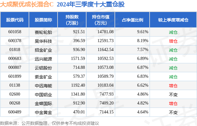 从基金规模来看,大成聚优成长混合C基金2024年三季度公布的基金规模为2.38亿元,较上一期规模2.36亿元变化了141.86万元,环比变化了0.6%。该基金最新一期资产配置为:股票占净值比93.74%,无债券类资产,现金占净值比6.68%。从基金持仓来看,该基金当季前十大股票仓位达66.9%,第一大重仓股为赛轮轮胎(601058),持仓占比为9.61%。