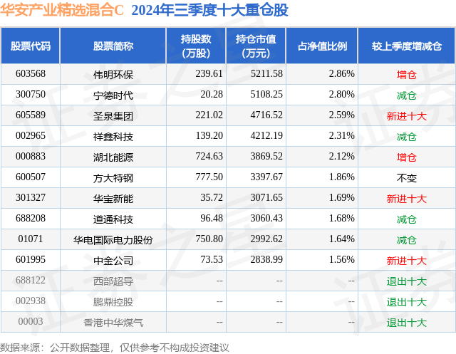 从基金规模来看,华安产业精选混合C基金2024年三季度公布的基金规模为6.16亿元,较上一期规模5.65亿元变化了5012.69万元,环比变化了8.87%。该基金最新一期资产配置为:股票占净值比86.2%,无债券类资产,现金占净值比12.56%。从基金持仓来看,该基金当季前十大股票仓位达21.11%,第一大重仓股为伟明环保(603568),持仓占比为2.86%。