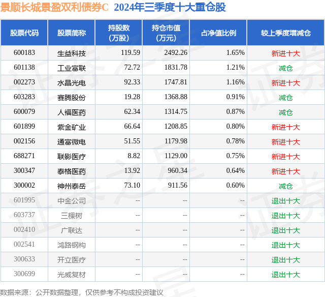 从基金规模来看,景顺长城景盈双利债券C基金2024年三季度公布的基金规模为0.25亿元,较上一期规模2928.3万元变化了-392.06万元,环比变化了-13.39%。该基金最新一期资产配置为:股票占净值比18.39%,债券占净值比105.73%,现金占净值比3.24%。从基金持仓来看,该基金当季前十大股票仓位达9.37%,第一大重仓股为生益科技(600183),持仓占比为1.65%。