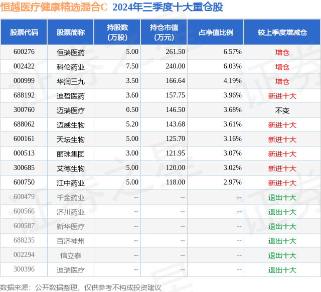 证券之星消息,日前恒越医疗健康精选混合C基金公布三季报,2024年三季度最新规模0.14亿元,季度净值涨幅为11.33%。