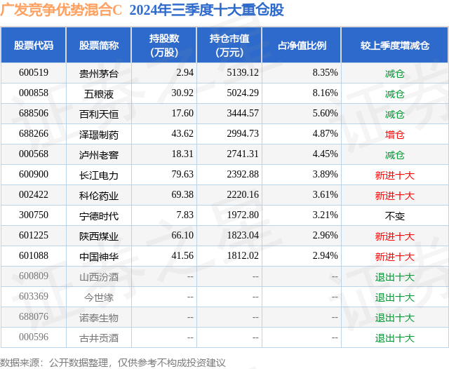 从基金规模来看,广发竞争优势混合C基金2024年三季度公布的基金规模为0.15亿元,较上一期规模1445.14万元变化了97.72万元,环比变化了6.76%。该基金最新一期资产配置为:股票占净值比92.57%,无债券类资产,现金占净值比6.49%。从基金持仓来看,该基金当季前十大股票仓位达48.04%,第一大重仓股为贵州茅台(600519),持仓占比为8.35%。