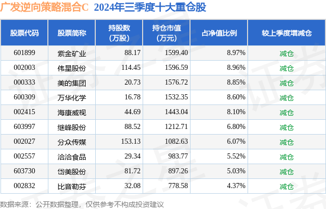 从基金规模来看,广发逆向策略混合C基金2024年三季度公布的基金规模为0.31亿元,较上一期规模9950.04万元变化了-6803.99万元,环比变化了-68.38%。该基金最新一期资产配置为:股票占净值比94.27%,无债券类资产,现金占净值比5.87%。从基金持仓来看,该基金当季前十大股票仓位达71.27%,第一大重仓股为紫金矿业(601899),持仓占比为8.97%。