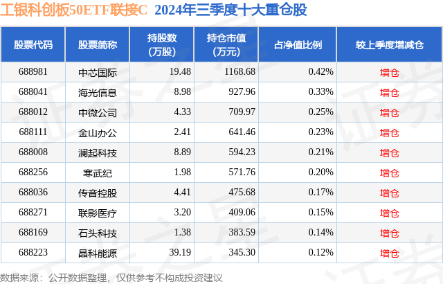 从基金规模来看,工银科创板50ETF联接C基金2024年三季度公布的基金规模为12.07亿元,较上一期规模7.92亿元变化了4.15亿元,环比变化了52.43%。该基金最新一期资产配置为:股票占净值比4.11%,债券占净值比1.08%,现金占净值比4.4%。从基金持仓来看,该基金当季前十大股票仓位达2.22%,第一大重仓股为中芯国际(688981),持仓占比为0.42%。