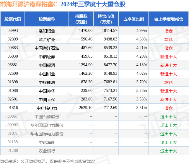 从基金规模来看,前海开源沪港深裕鑫C基金2024年三季度公布的基金规模为14.24亿元,较上一期规模10.13亿元变化了4.11亿元,环比变化了40.63%。该基金最新一期资产配置为:股票占净值比90.13%,无债券类资产,现金占净值比11.05%。从基金持仓来看,该基金当季前十大股票仓位达40.84%,第一大重仓股为洛阳钼业(03993),持仓占比为4.99%。