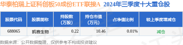 从基金规模来看,华泰柏瑞科创板50ETF联接A基金2024年三季度公布的基金规模为5.86亿元,较上一期规模4.76亿元变化了1.1亿元,环比变化了23.22%。该基金最新一期资产配置为:股票占净值比0.01%,债券占净值比2.53%,现金占净值比2.67%。从基金持仓来看,该基金当季前十大股票仓位达0.01%,第一大重仓股为凯赛生物(688065),持仓占比为0.01%。